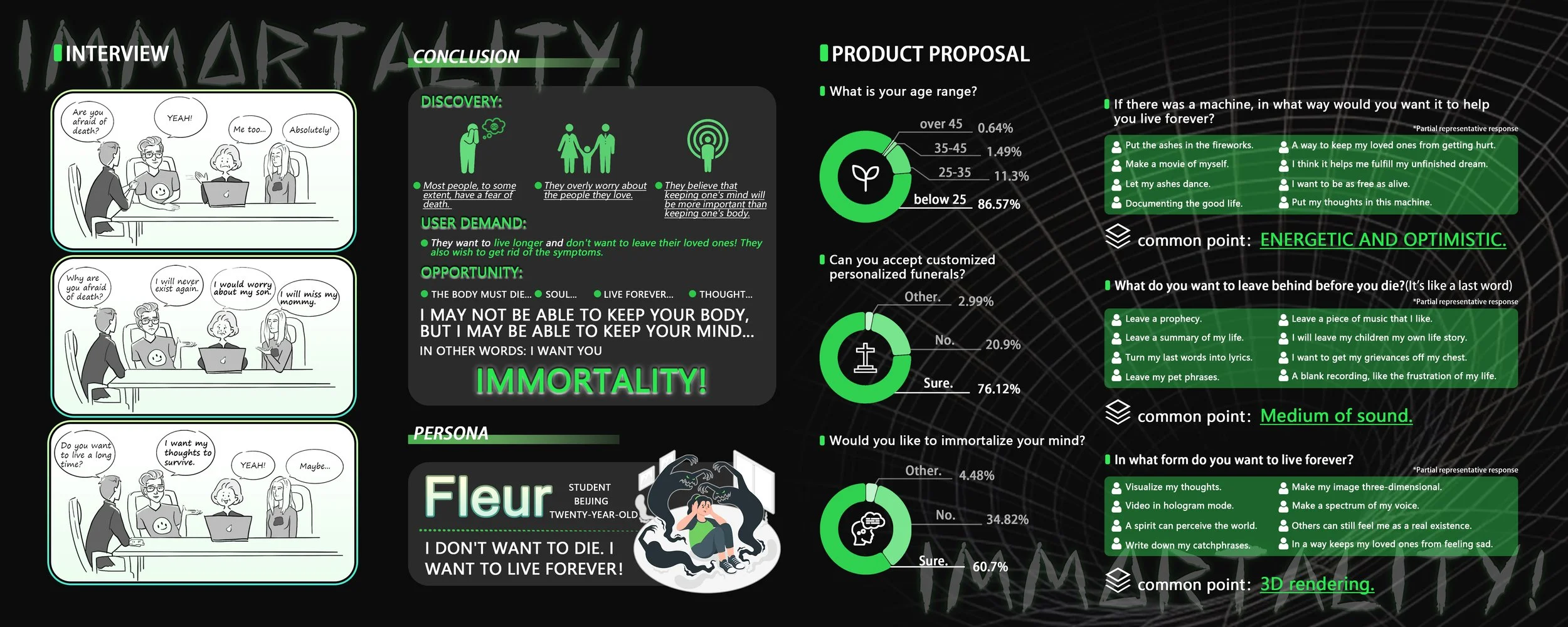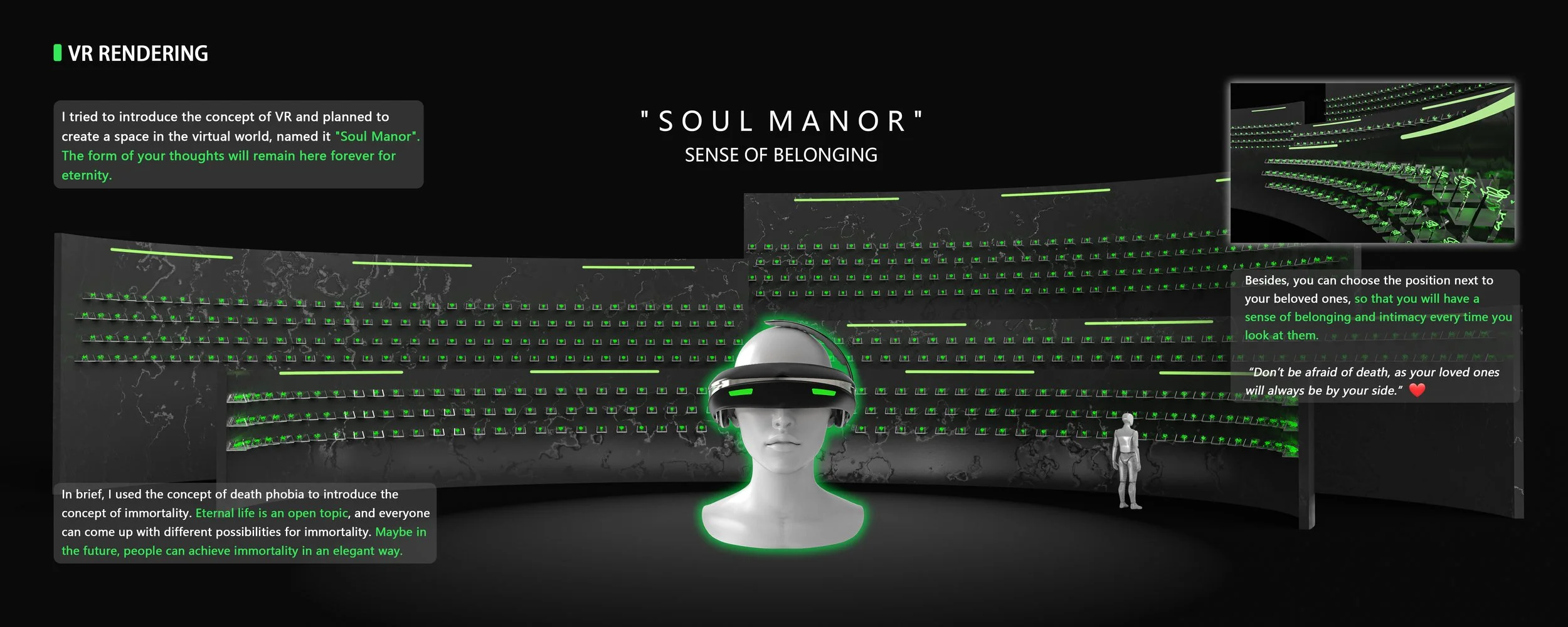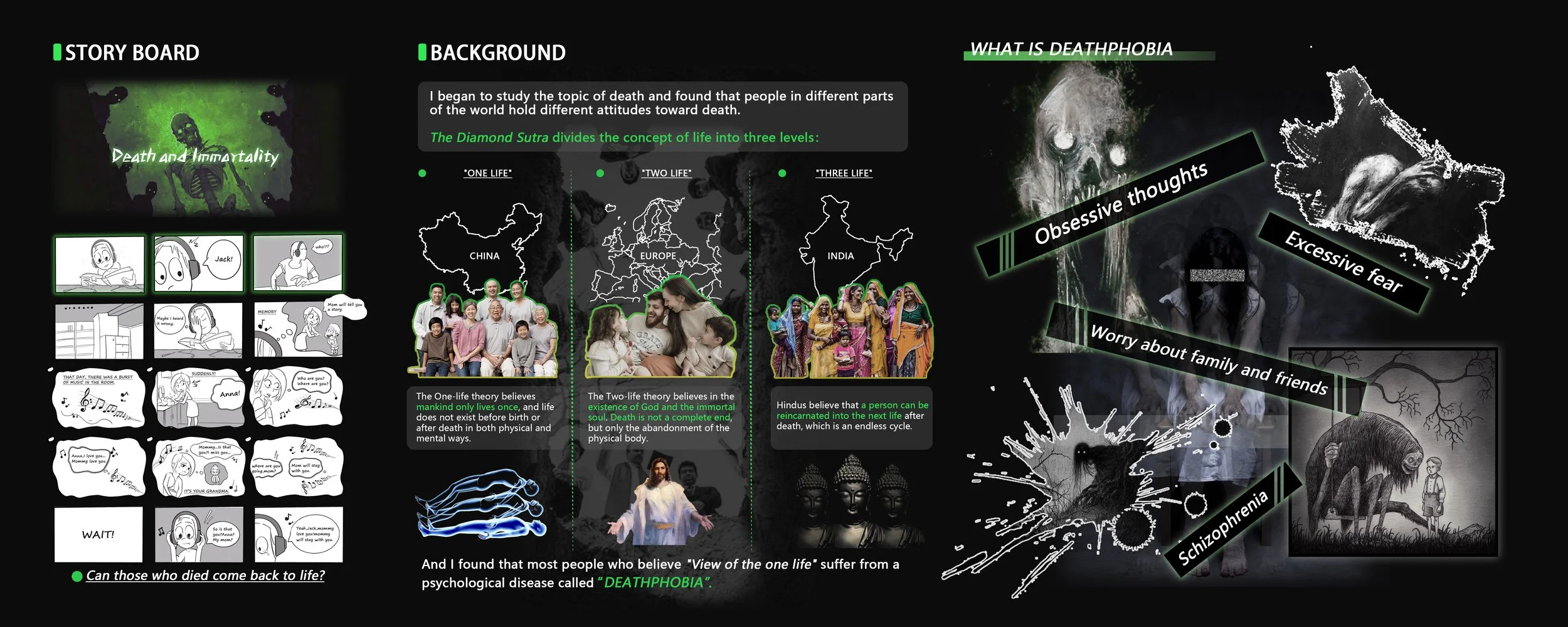 The project also investigates the possibility of human immortality, proposing an alternative direction for this concept. At the same time, I reflect on people who suffer from death anxiety, connecting their emotional experiences with the idea of eternal life. Through this work, I hope to help people develop a more peaceful and accepting perspective on death.