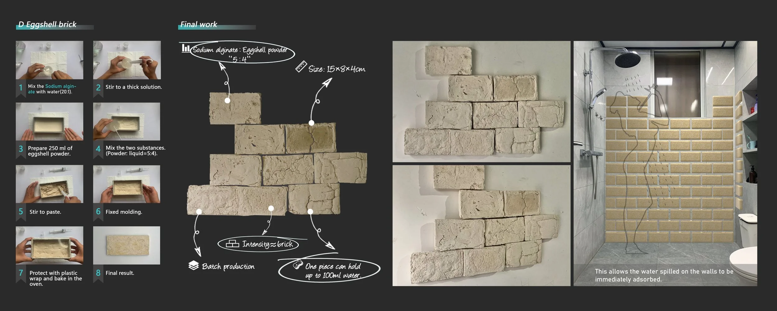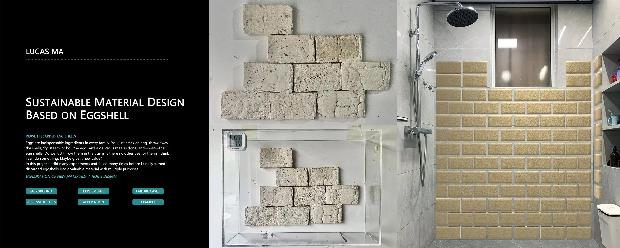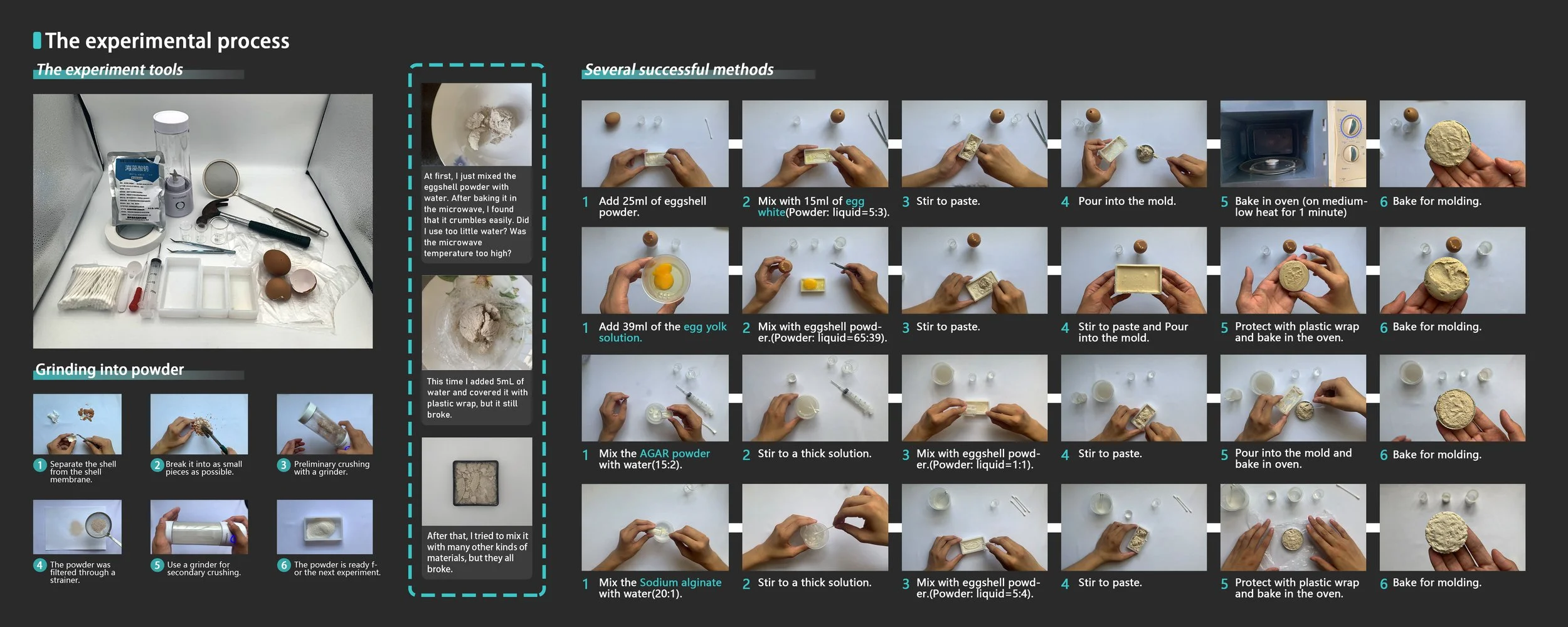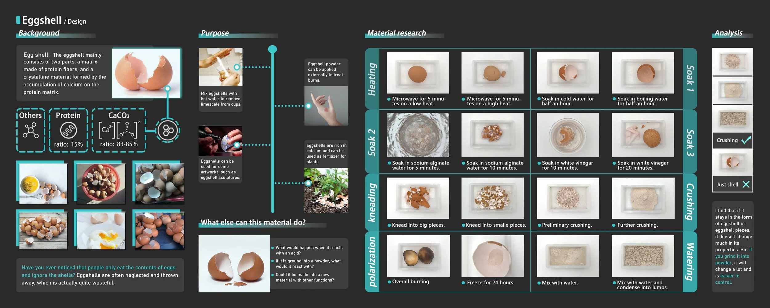 In this project, I experimented with combining eggshells with several chemical materials. Through many trials — and many failures — I eventually transformed waste eggshells into a versatile and valuable material with multiple applications.